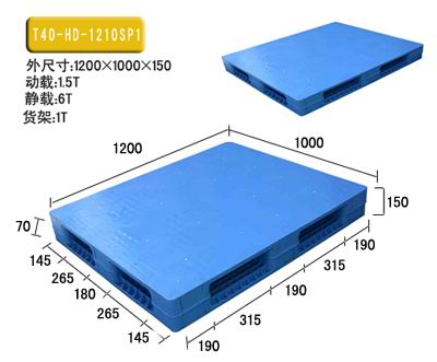 產(chǎn)品型號(hào): AT-1210SP1 產(chǎn)品貨號(hào): T40 產(chǎn)品外尺寸: 1200×1000×150 產(chǎn)品內(nèi)尺寸: 產(chǎn)品結(jié)構(gòu): 雙面平板 產(chǎn)品內(nèi)容量(L): 承重量(T): 動(dòng)載:1.5T 靜載:6T 貨架:1T 產(chǎn)品認(rèn)可標(biāo)準(zhǔn): ISO9001:2000質(zhì)量體系認(rèn)證 此款塑料托盤(pán)為雙面平板面重型;