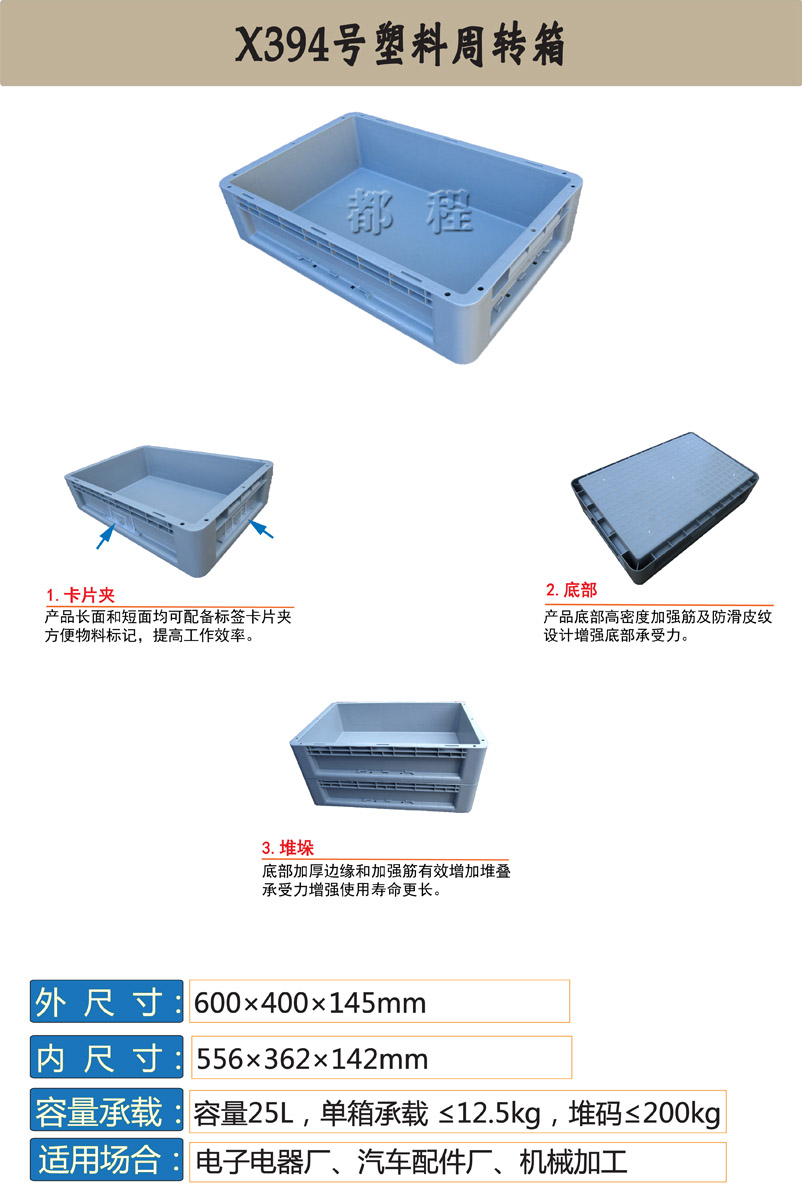 編號(hào): 394 外尺寸(mm): 600*400*145 內(nèi)尺寸(mm): 556*362*142 內(nèi)容積(L): 25 備注: 適用于電子電器廠、汽車配件廠、機(jī)械加工廠等行業(yè)。
