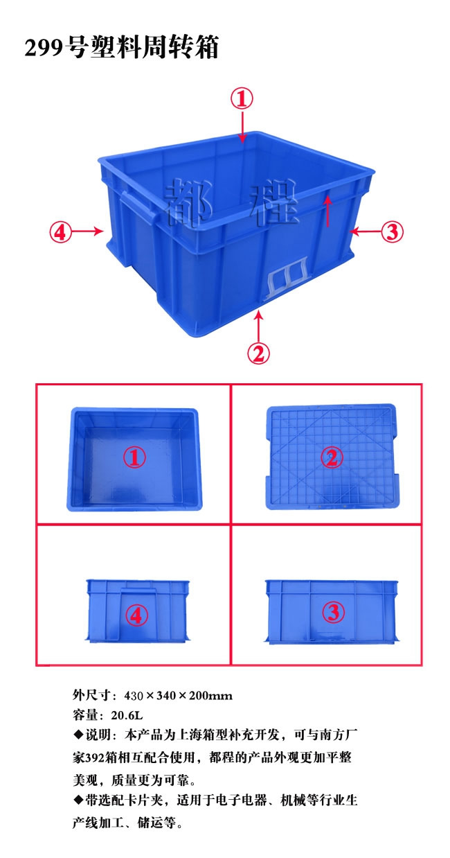 編號: X299 外尺寸(mm): 430*340*200 內(nèi)尺寸(mm): 392*305*190 內(nèi)容積(L): 20.6 備注: 可選配卡片夾。適用于電子電器、機械等行業(yè)加工、儲運。