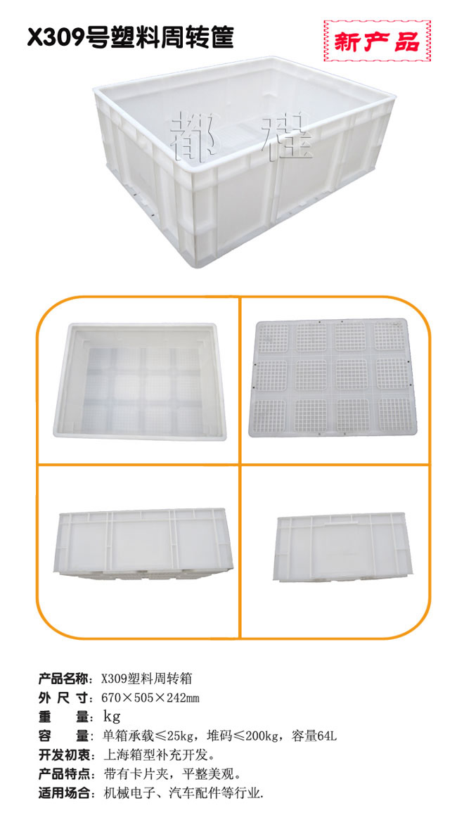 編號: 309 外尺寸(mm): 670*505*242 內(nèi)尺寸(mm): 635*465*225 內(nèi)容積(L): 64 備注: 適用于機械電子、汽車配件等行業(yè)。
